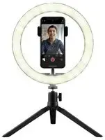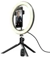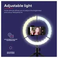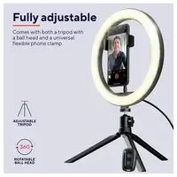 Always look your best with this light ring and add professional lighting to your vlogging channel. The 10" LED ring light casts the perfect lighting and is fully adjustable, so you look your best for any situation! The Maku vlogging kit comes with everything you need for perfect lighting including a tripod, phone clamp and wireless remote. Powered by a standard USB connection, the light works with almost any phone charger or powerbank (not included).