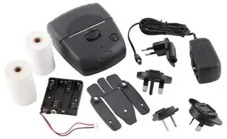 Printer, NiMH battery, primary cell adaptor, AC adaptor, data cable, mounting bracket, 2x paper rolls and user guide